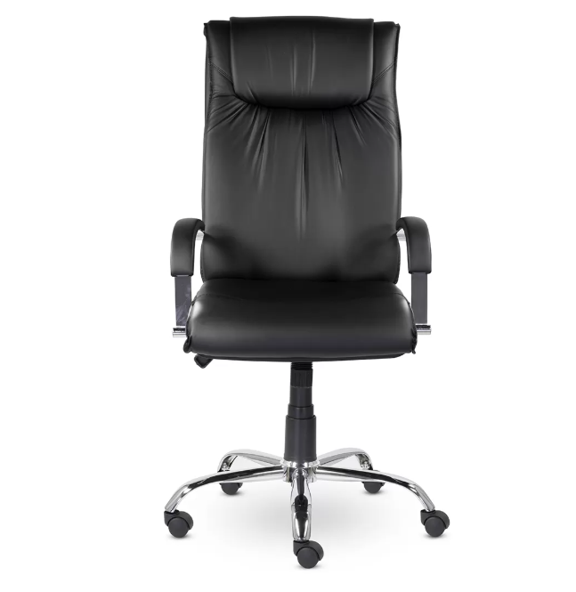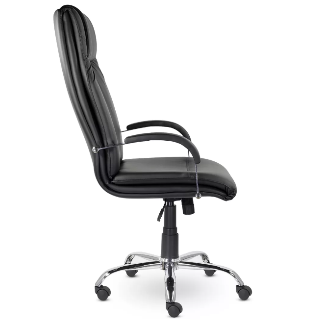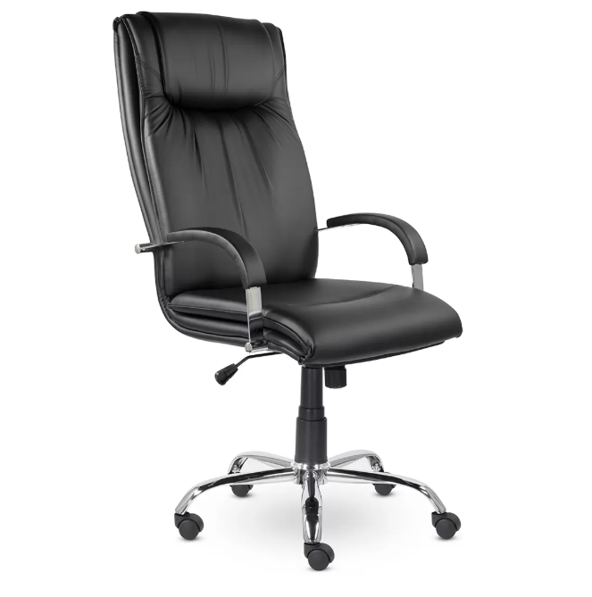 Солидное кресло руководителя имеет прошивку на спинке в области шеи, тем самым выделяя подголовник, а прошивка на сидении необходима для более комфортной посадки. На хромированных подлокотниках мягкие накладки. Максимальная нагрузка 120 кг.