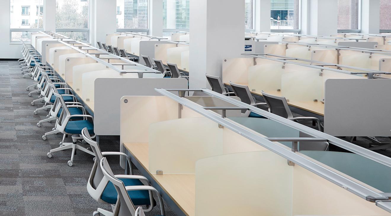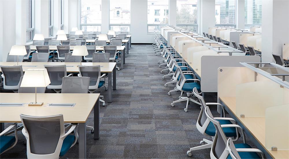 Разделенный читальный стол позволяет сосредоточиться во время обучения и создает плавное учебное пространство благодаря своему изогнутому дизайну и полупрозрачным материалам.