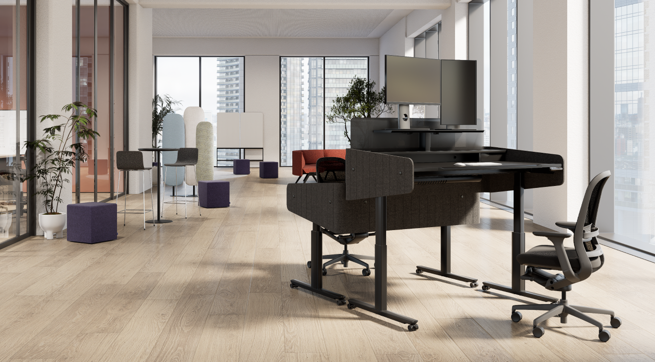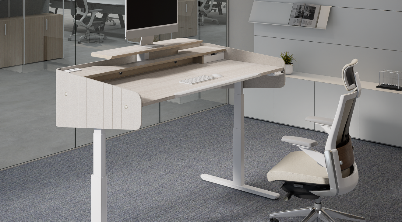 Инновационный стол с функциональностью стандартной регулировки высоты и дополнительным преимуществом точной регулировки полки для монитора.