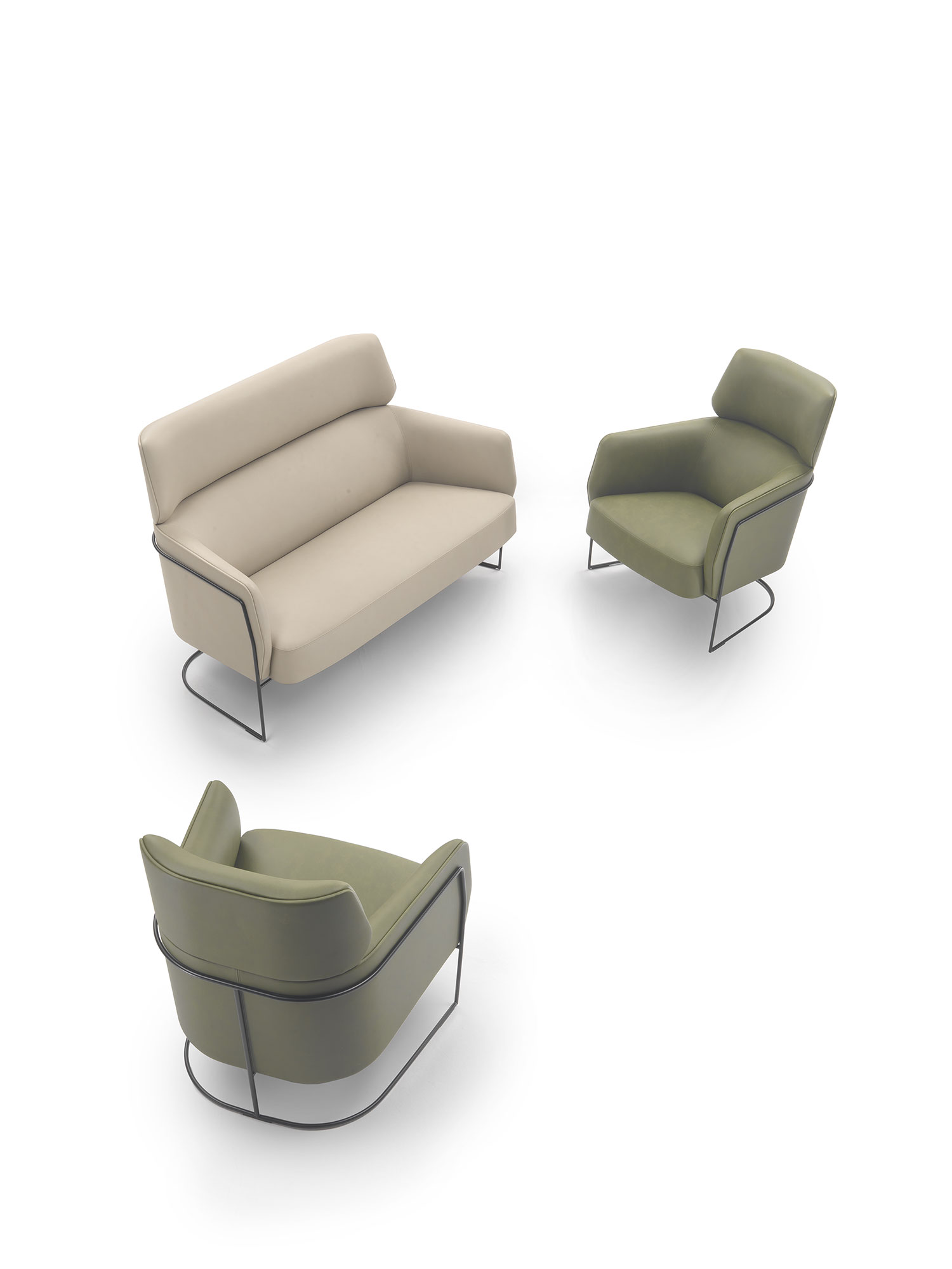 Мягкая, изогнутая оболочка поддерживается элегантной металлической рамой, доступной в различных отделках.