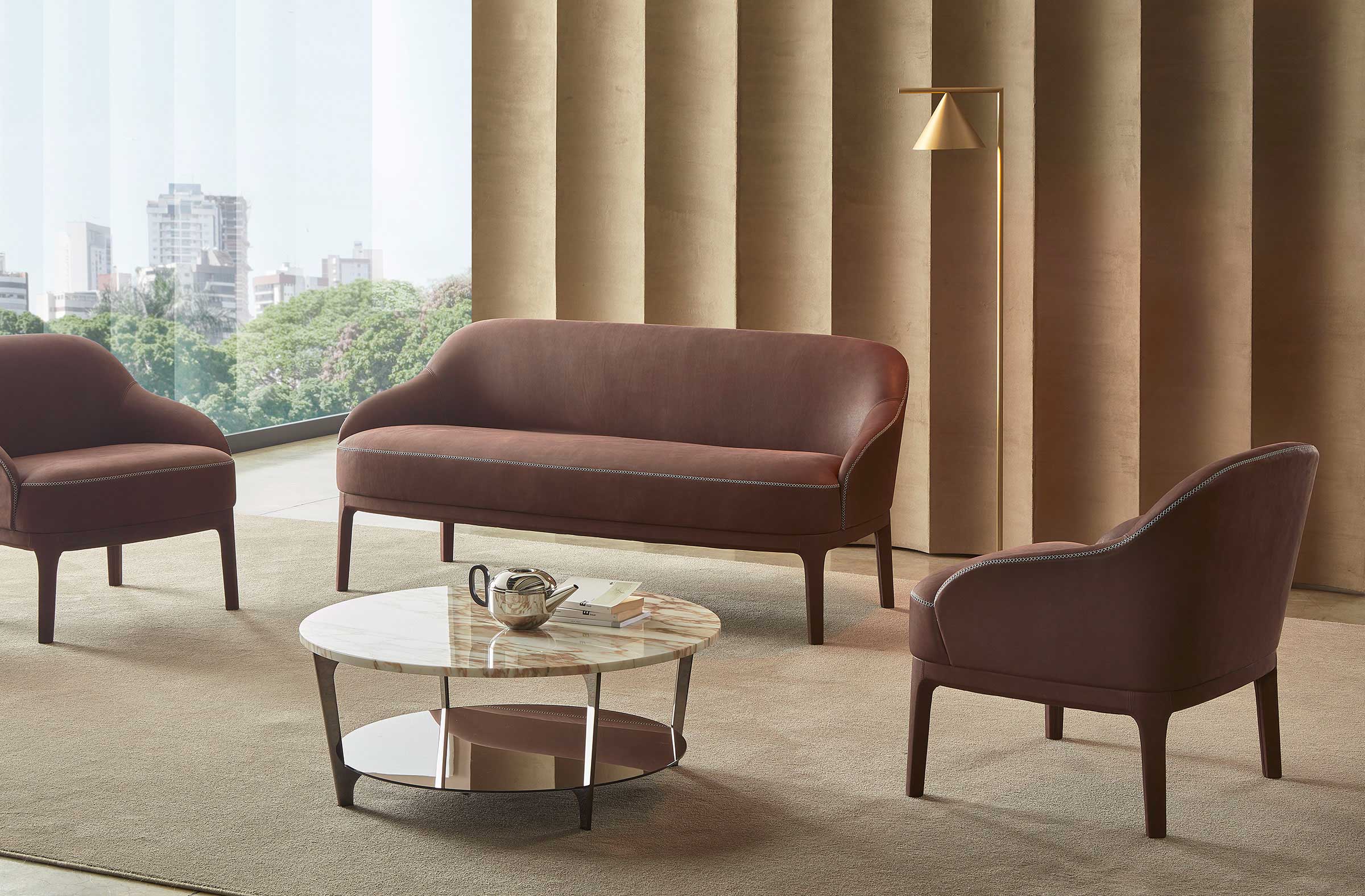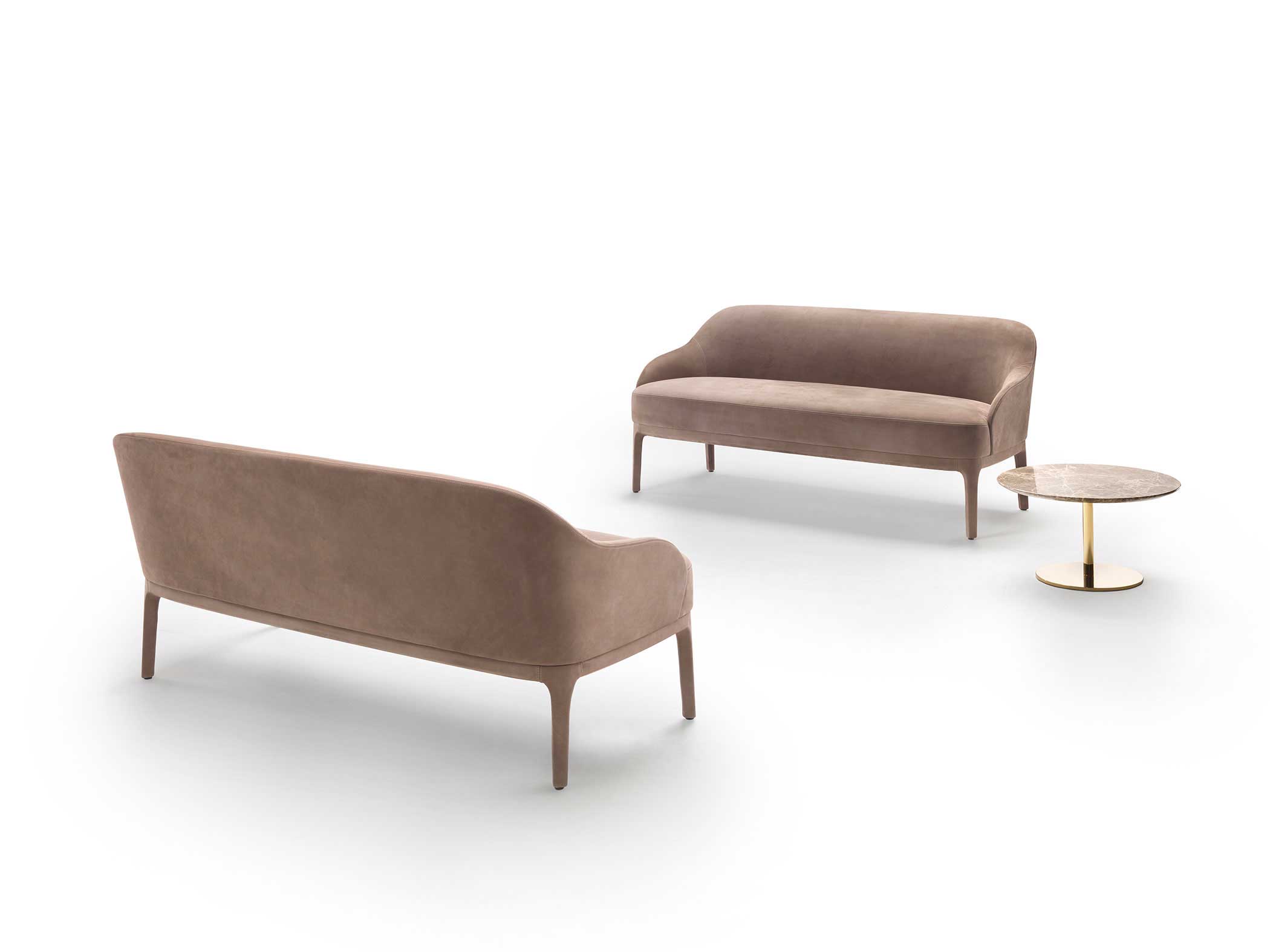 Основание сидений выполнено из дерева; при желании его можно обить тем же материалом, который выбран для обитой части. Еще одной опцией кастомизации является двухцветный/биматериальный вариант, который позволяет комбинировать два разных материала, например, ткань для внутренней части и кожу для внешней части спинки.