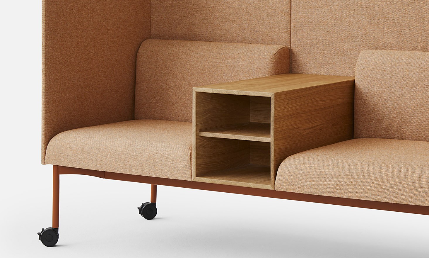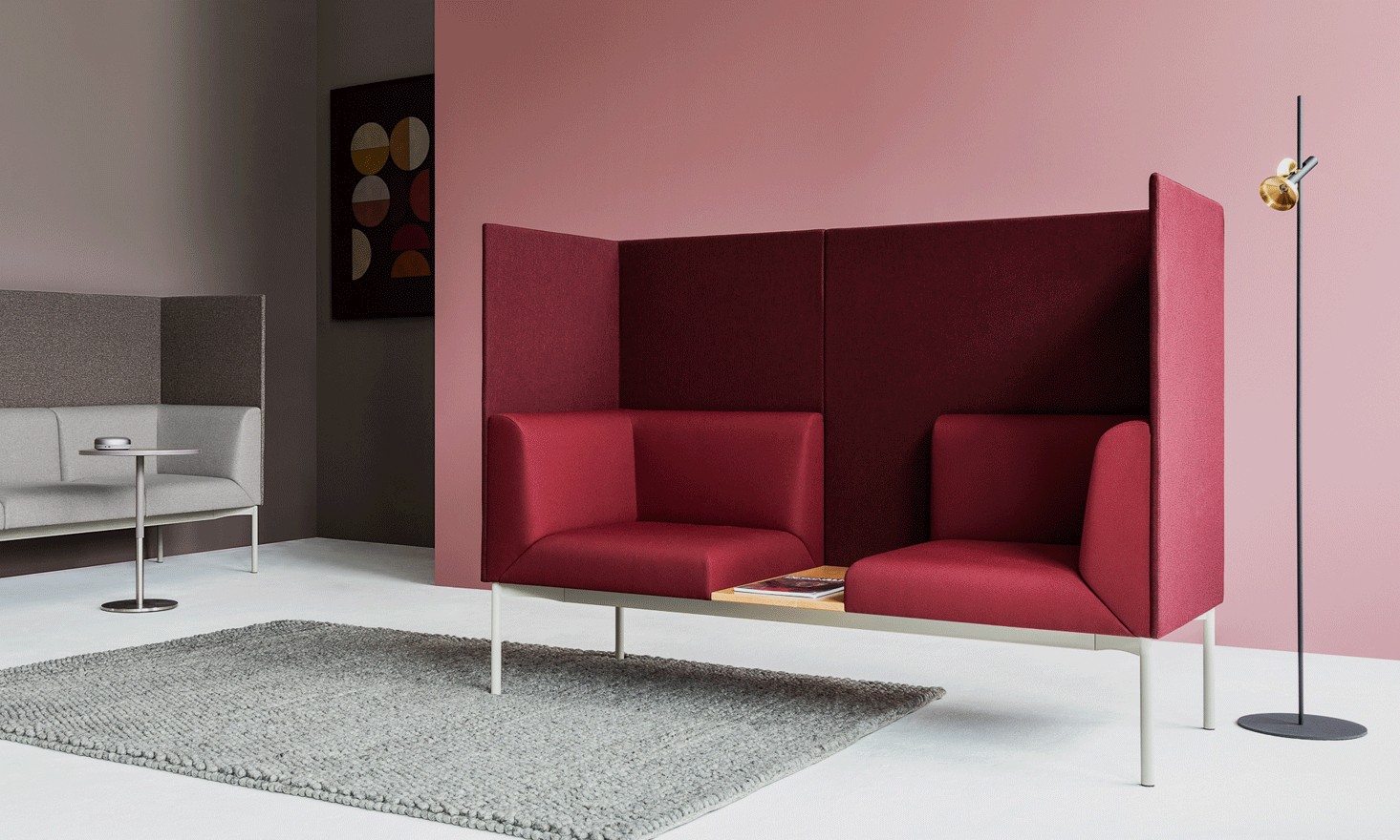 Яркой особенностью коллекции являются дополнительные панели, доступные в двух высотах, которые можно прикрепить к спинкам. В зависимости от выбранной высоты они могут разделять рабочие и зоны отдыха или служить перегородками, которые тем не менее сохраняют открытую формулу дивана или кресла. Также возможно перевернуть модули и, в больших островах, соединить спинки вместе с задней стороны, образуя два ряда, обращенных в противоположные стороны.