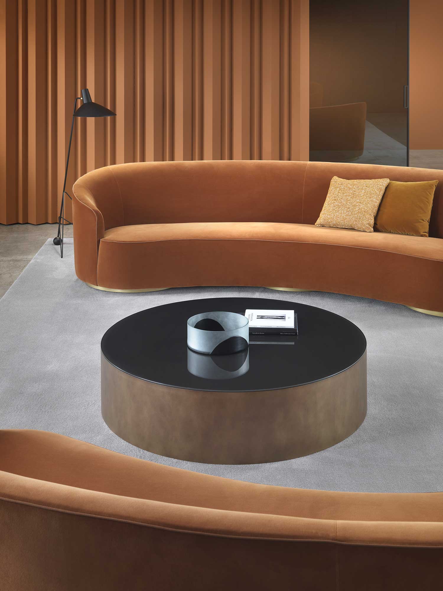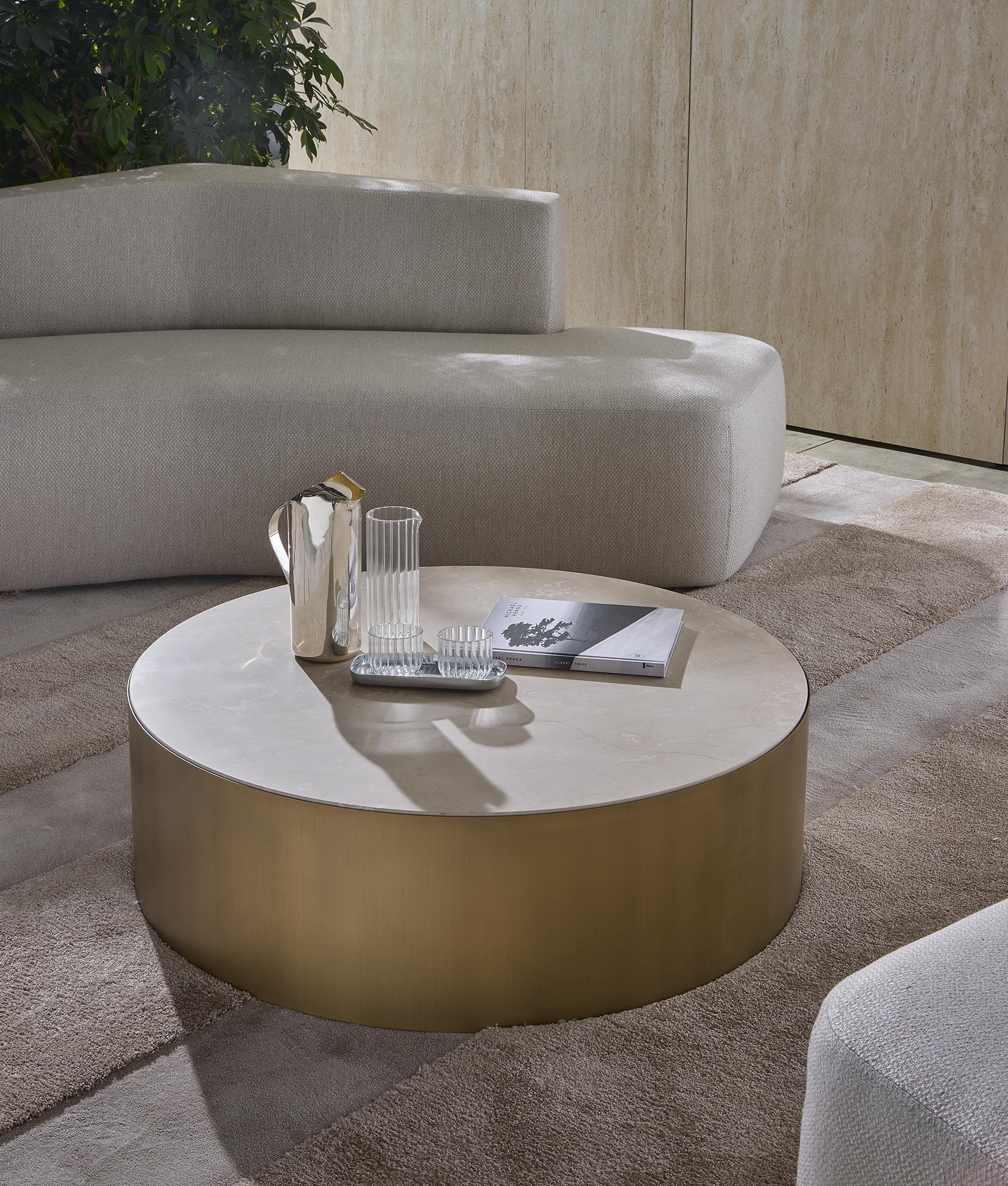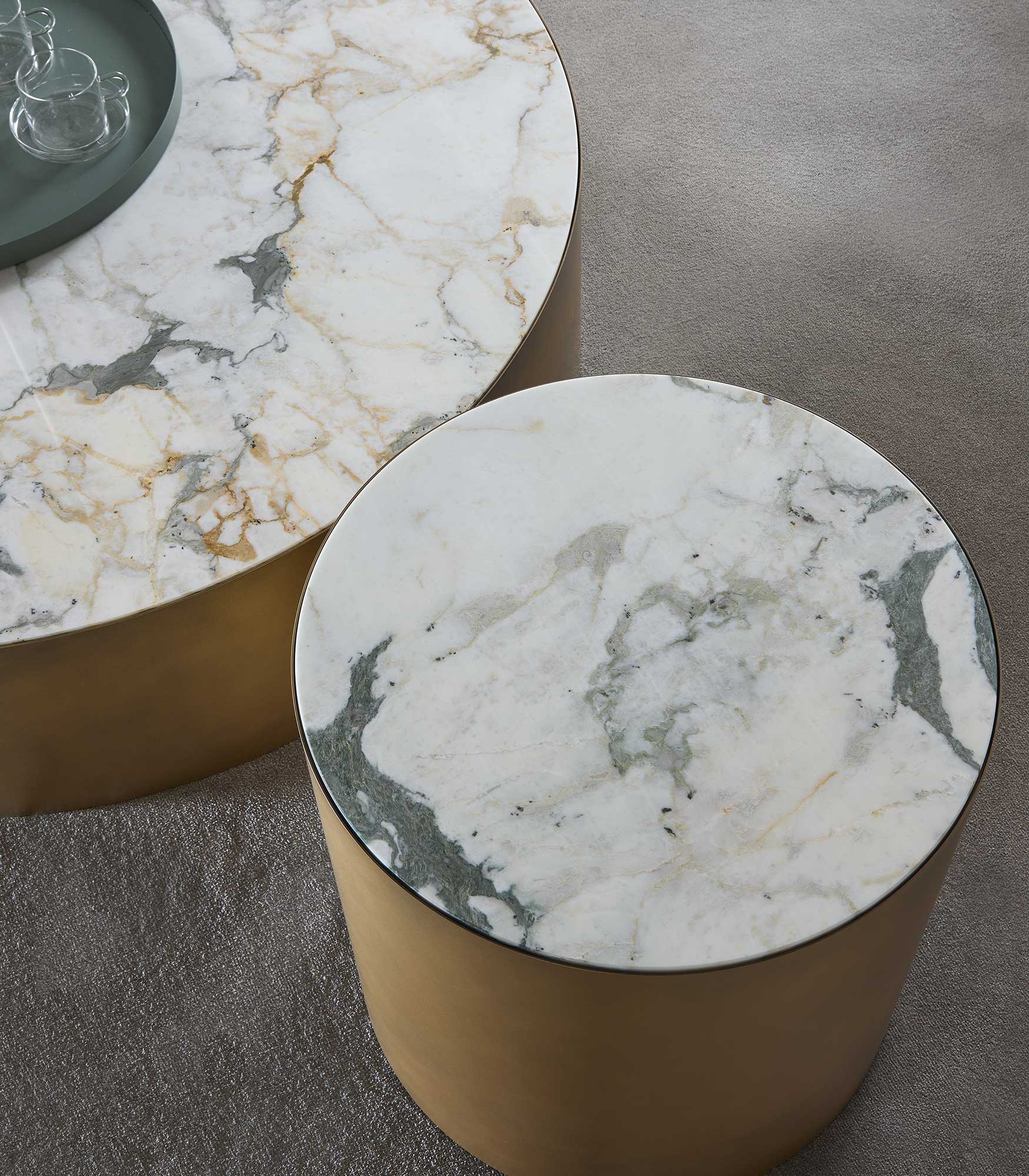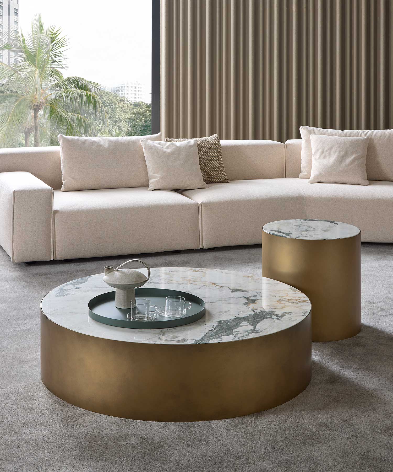 Arthur — это серия кофейных столиков с скульптурными линиями и высоким визуальным воздействием. Они состоят из металлической цилиндрической основы и столешницы, доступной в мраморе или стекле. Это сочетание материалов придает кофейным столикам элегантный и современный вид.