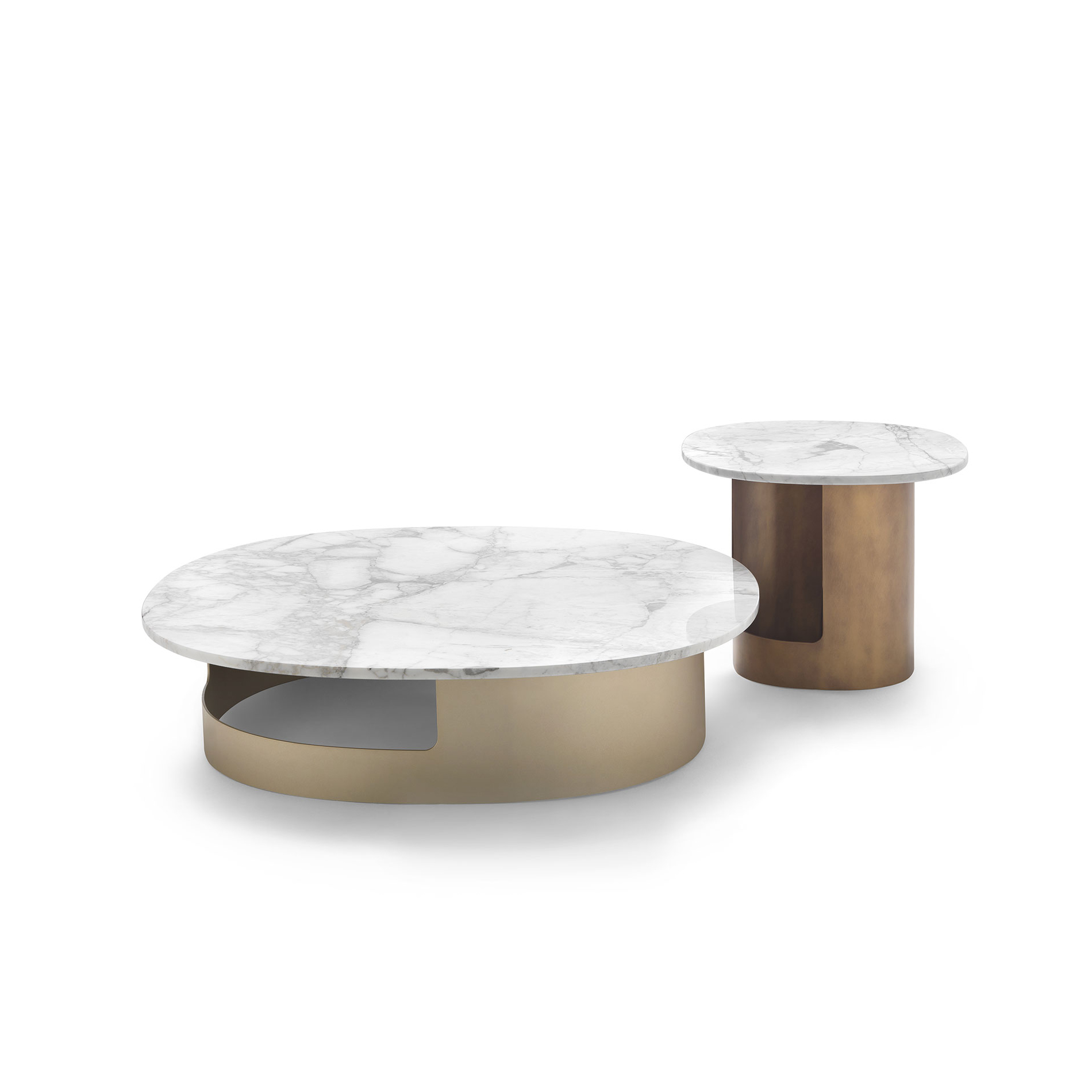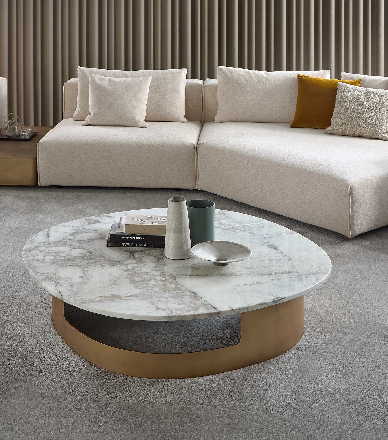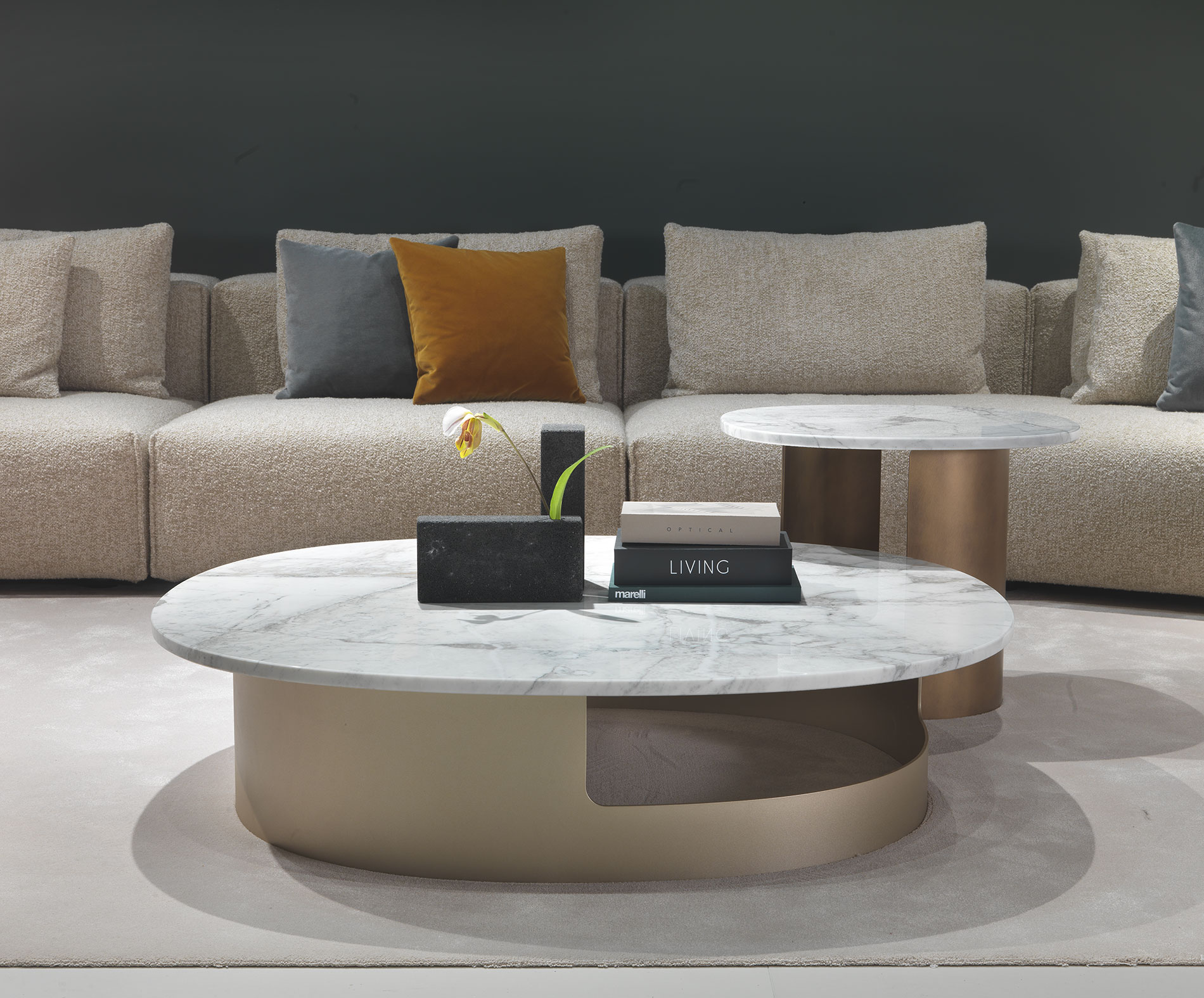 Вы можете выбрать столешницу из мрамора, керамического гранита или стекла. Основание выполнено из металла, которое можно настроить с помощью широкого спектра отделок, доступных в каталоге. Однако отделки с brushed не доступны для основания кофейных столиков Кофи.